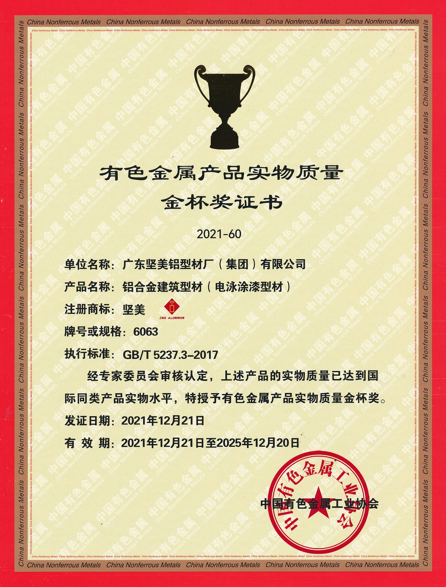 2021年金杯奖证书 电泳涂漆型材 中文(中国有色金属工业协会)
