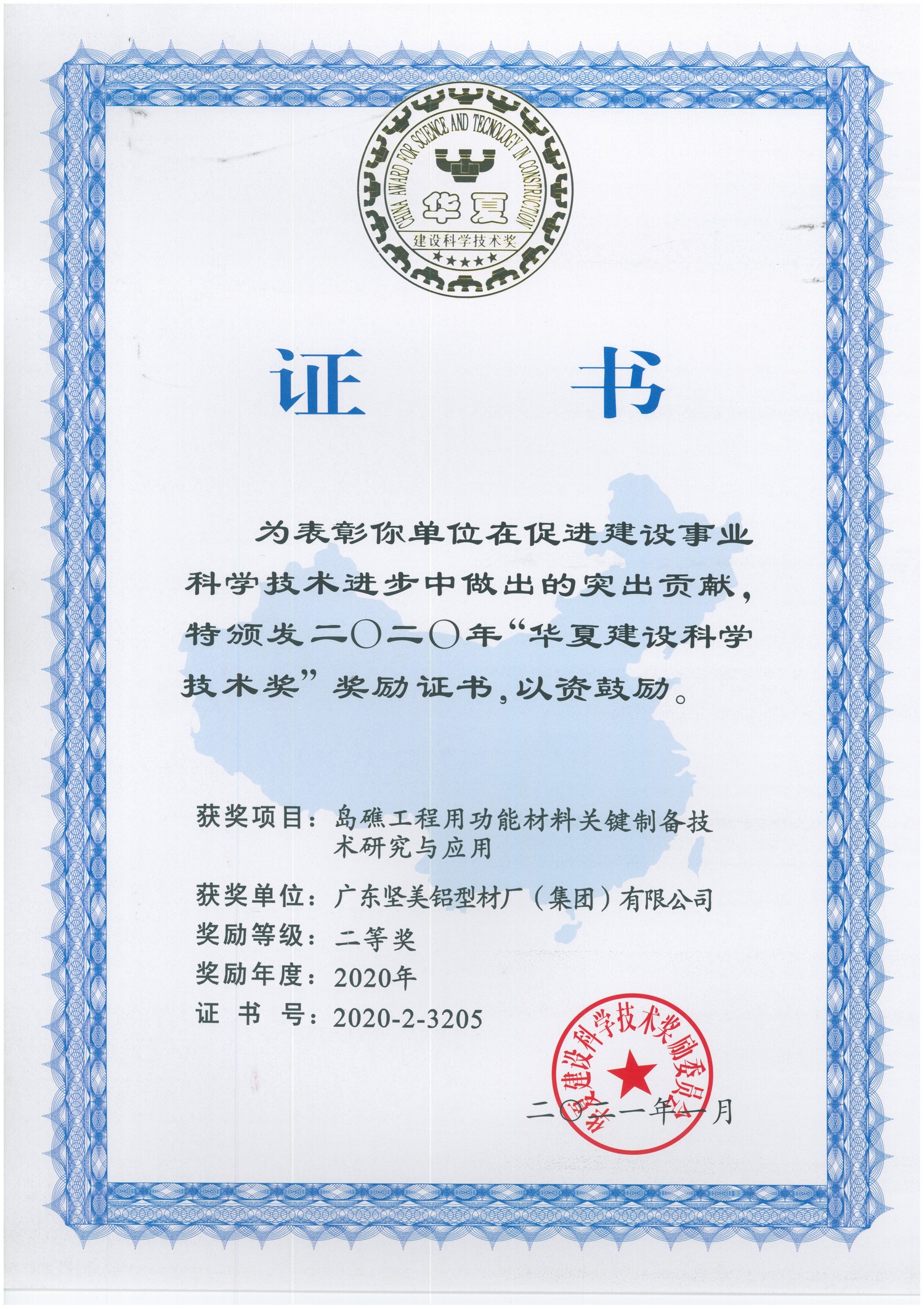 2021年1月 2020年华夏建设科学技术奖(二等奖):岛礁工程用功能材料关键制备技术研究与应用:广东坚美(华夏建设科学技术奖励委员会)