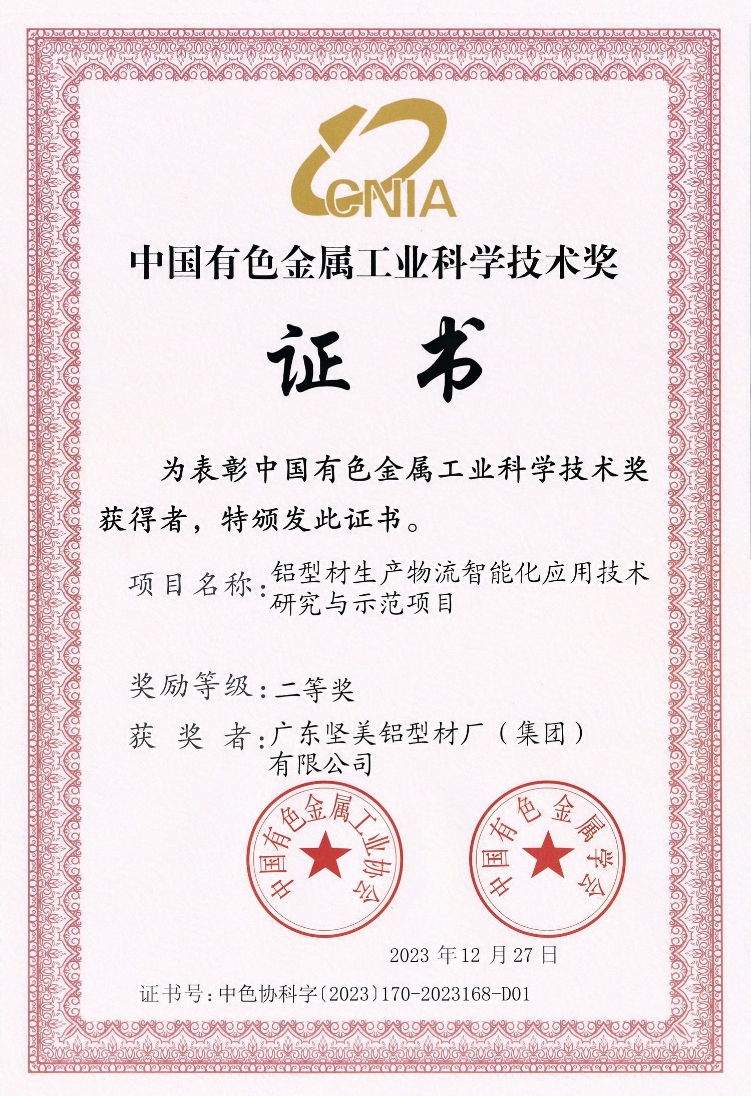2023年12月27日 中国有色金属工业科学技术奖二等奖:铝型材生产物流智能化应用技术研究与示范项目:广东坚美(中国有色金属工业协会)