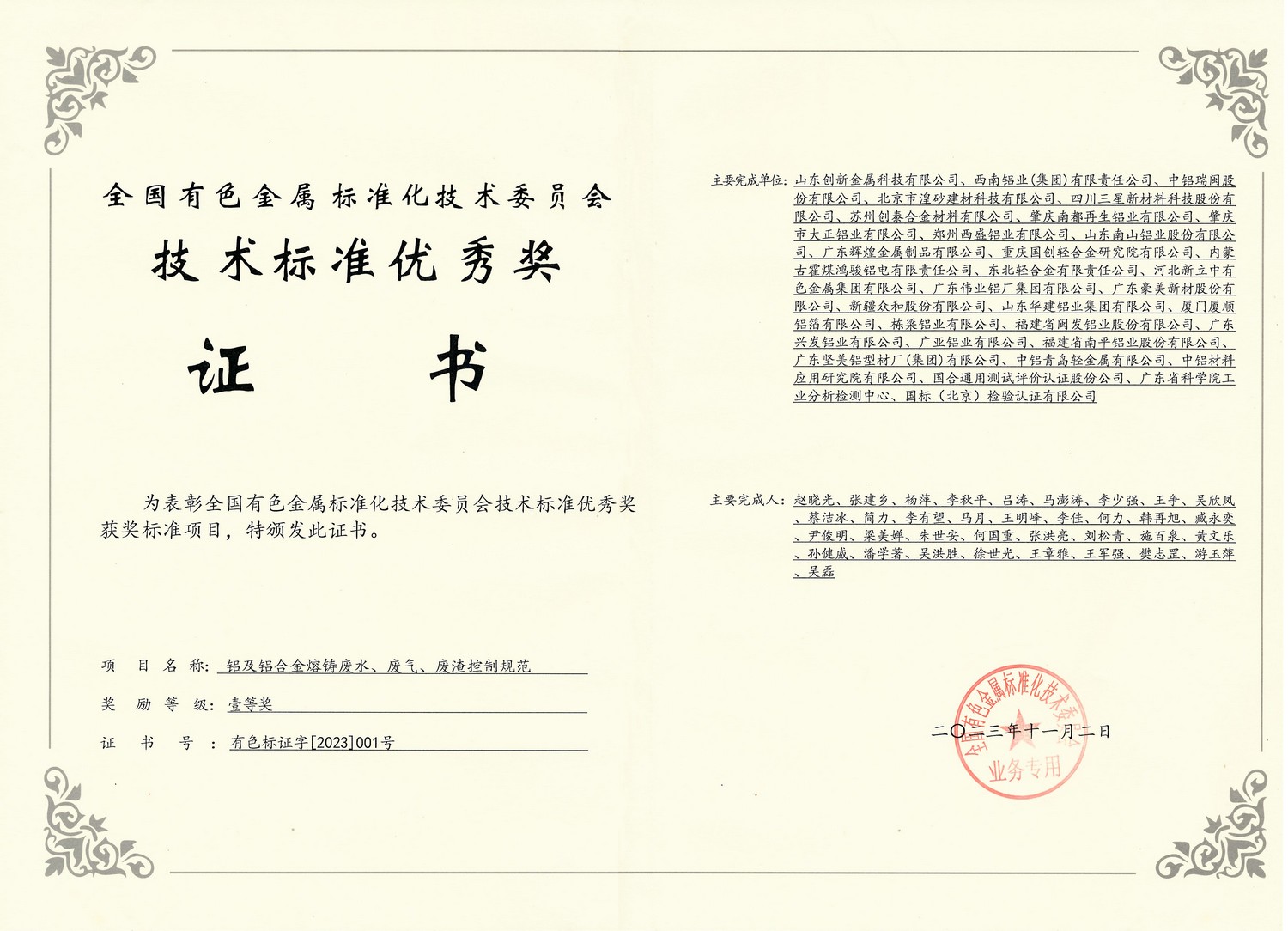 2023年11月2日 技术标准一等奖-铝及铝合金熔铸废水、废气、废渣控制规范(全国有色金属标准化技术委员会)