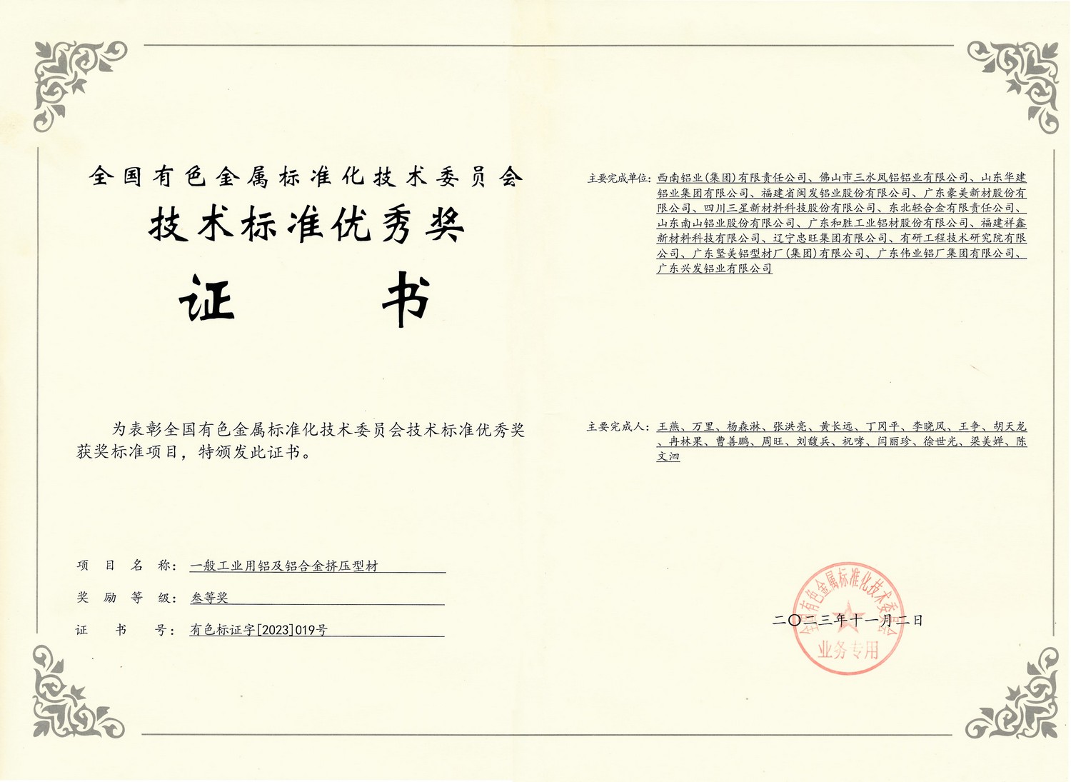 2023年11月2日 技术标准三等奖-GB一般工业用铝及铝合金挤压型材(全国有色金属标准化技术委员会)