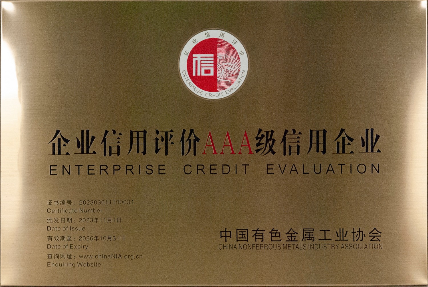 2023年11月1日 中国有色金属工业协会 企业信用评价AAA级信用企业