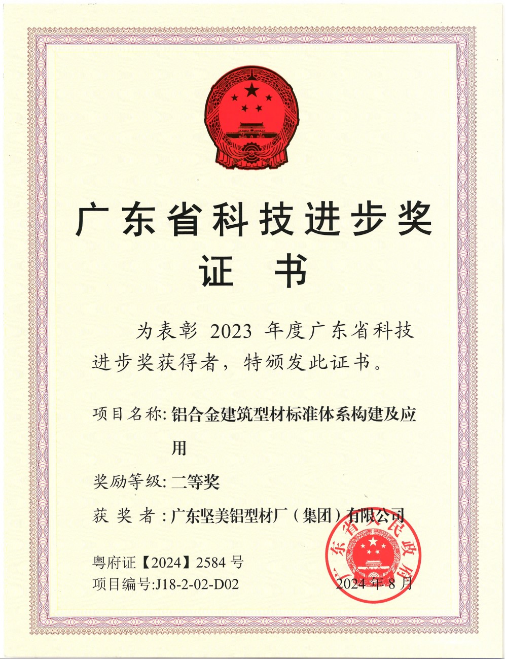 2024年8月 广东省科技进步奖 坚美公司 二等奖