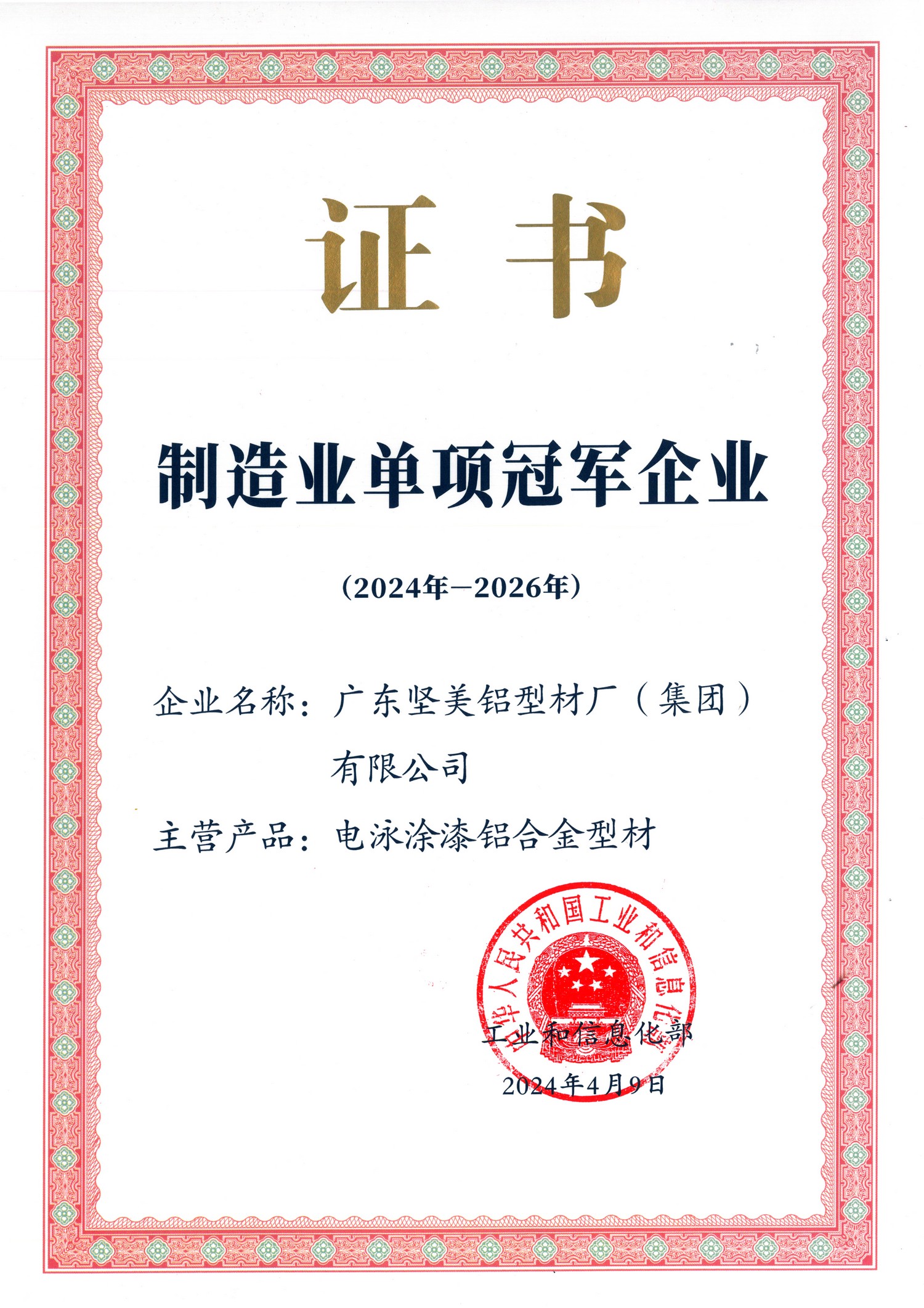 2024年4月 制造业单项冠军企业证书 电泳涂漆产品 广东坚美 国家工信部(2024-2026)